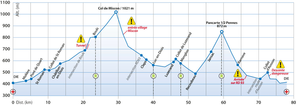 Didier a participé à l'épreuve "la Panoramique" ce dimanche. Il s'agissait d'un parcours de 80 kilomètres avec un dénivelé positif de 1300 mètres. Deux cols étaient au programme, le col de Miscon, culminant à 1021 mètres d'altitude, et le col de Penne Pancarte, atteignant 871 mètres d'altitude.